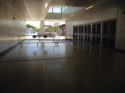 There is a space at the end of the station that looks like a large broom cupboard. A station attendent told me it was going to be used as secure cycle parking, but that there was a possibility it might be turned into a little shop and of course that commercial interests win out... Outside, in the sweeping new bus interchange there isn't a single cycle hoop to behold.